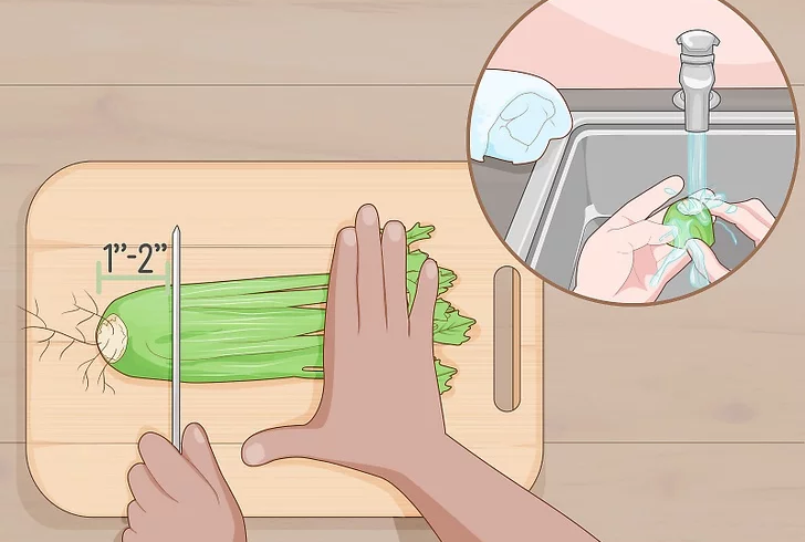 1 – ساقههای کرفس را از پایه آن جدا کنید. با استفاده از یک چاقوی تیز این کار را انجام دهید. اجازه دهید 3 تا 5 سانتیمتر از پایه باقی بماند. این کار باعث میشود ساقههای جدید بتوانند رشد کنند بدون اینکه مواد مغذی مورد نیاز آنها از بین بروند. ته کرفس را با آب بشویید و سپس آن را با دستمال خشک کنید. اطمینان حاصل کنید که ته کرفس کاملا تمیز شود و هیچ گونه آلودگی روی آن نباشد.